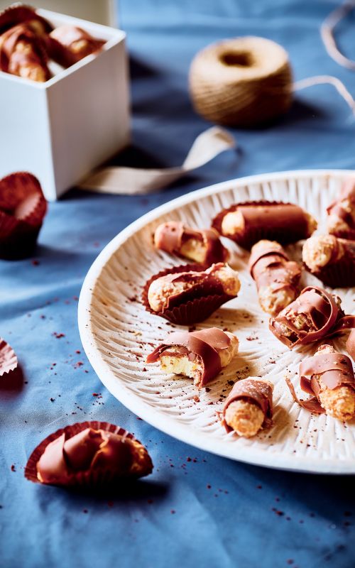 Z dvema žličkama iz mase oblikujemo manjše kroglice in jih povaljamo v kokosovih kosmičih.