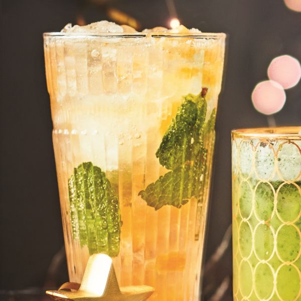 Dodamo pest ledu, meto in po želji vodo cvetov pomarančevca. Nato počasi prilijemo gazirano vodo, da sega do vrha kozarca. Postrežemo.