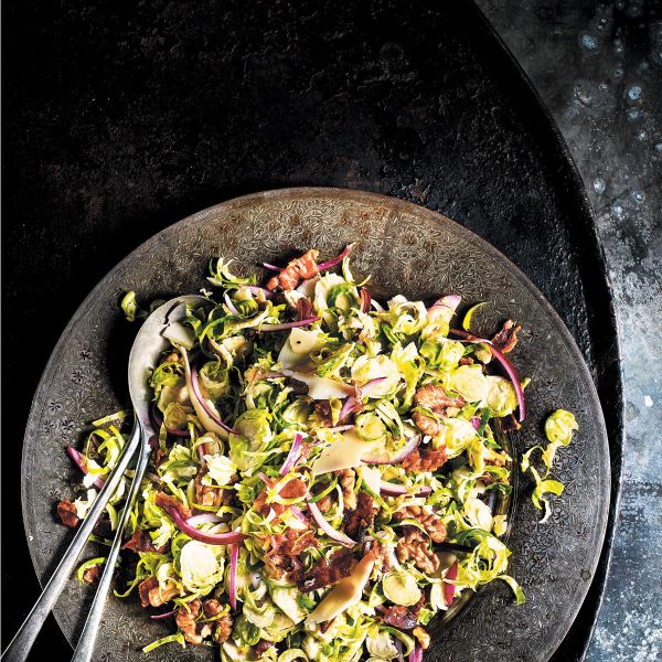 Brstični ohrovt otrebimo in mu odstranimo porjavele zunanje lističe, nato ga naribamo na tanke rezine. Damo ga v skledo z ledeno mrzlo osoljeno vodo, medtem pa nadaljujemo s pripravo solate.