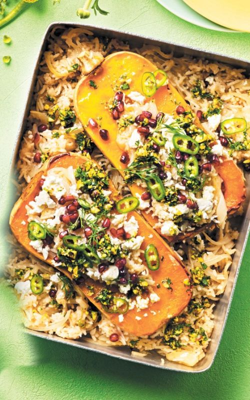 Pekač pokrijemo z aluminijasto folijo in pečemo 30 minut. Nato folijo odstranimo, bučo potisnemo ob dno, da jo tekočina čim bolj prekrije, in potresemo s sirom. Nepokrito pečemo še 30 minut oziroma dokler se buča ne zmehča, površina pa brbota in se zlato rumeno zapeče. Preden postrežemo, naj pečena zloženka kakih 10 minut počiva.