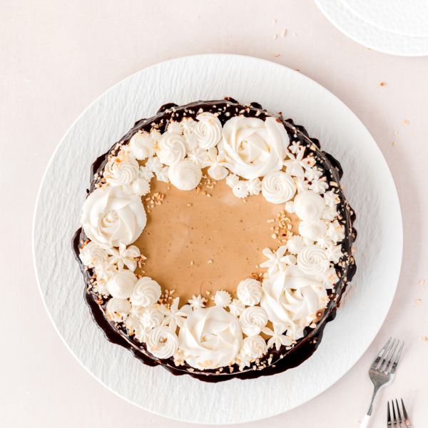 Preden torto postrežemo, jo previdno vzamemo iz modela. S prelivom ali stopljeno čokolado bogato oblijemo rob torte, da del steče po obodu. Sladko smetano stepemo in jo z različnimi nastavki umetelno nabrizgamo na vrh. Torto še posujemo z lešniki in jo postrežemo.
