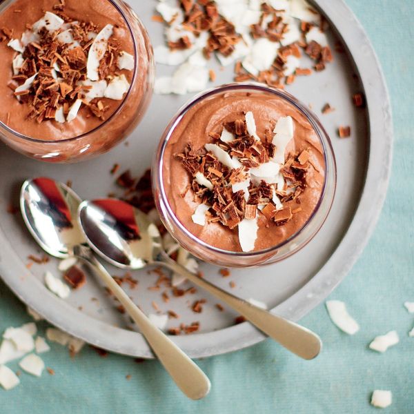 Mešanico razdelimo v 4 skledice ali kozarčke, jo posujemo s čokoladnimi ostružki in kokosovim čipsom ter postrežemo. Če sladice ne bomo postregli takoj, jo shranimo v hladilnik, posip pa dodamo tik pred postrežbo.