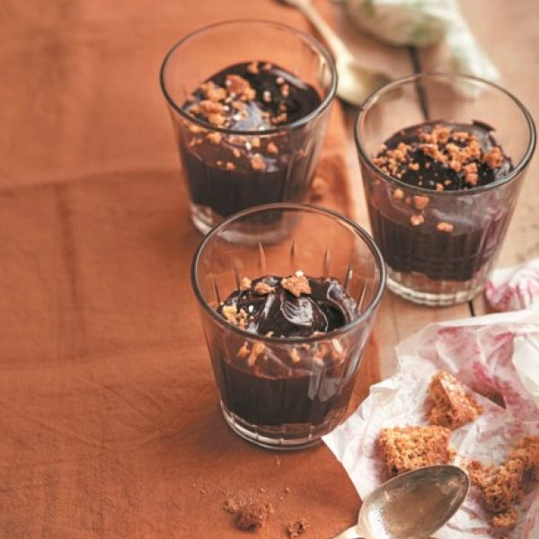 V drugi skledi z električnim mešalnikom 5 minut stepamo rumenjaka in sladkor, da dobimo svetlo, gosto in puhasto maso. Previdno vmešamo stopljeno čokoladno mešanico, da se vse skupaj poveže v bogato peno. Piškote nadrobimo in večino drobtin razdelimo v kozarčke, nato nanje naložimo čokoladno peno in za najmanj 2 uri postavimo v hladilnik. (V hladilniku se obdrži do 2 dni.)