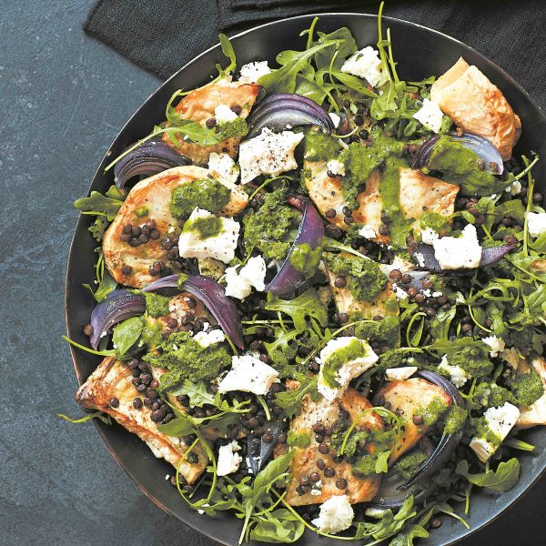 Preostalo rukolo razporedimo na velik krožnik in nanjo naložimo lečno mešanico. Obložimo jo s pečeno zeleno in čebulo, po vrhu nadrobimo feto in prelijemo s preostalim čimičurijem.