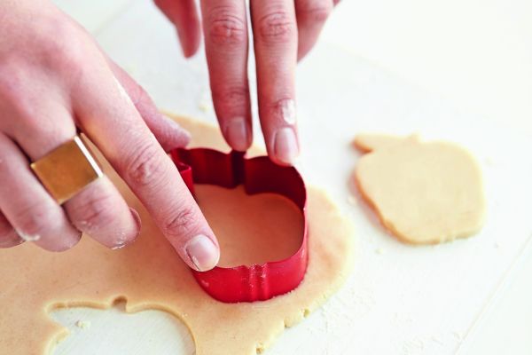 Testo razvaljamo na rahlo pomokani delovni površini 3 mm na debelo. Z modelčkoma v obliki jabolka in lista ali z ostrim nožkom izrežemo 12 piškotov v obliki jabolka in 12 v obliki lista. S paletnim nožem jih dvignemo in prenesemo na plitev pekač, obložen s papirjem za peko. Pečemo 8 do 10 minut oziroma tako dolgo, da se svetlo rumeno obarvajo. Pustimo, da se 5 minut ohlajajo, nato jih prenesemo na kuhinjsko mrežico, da se povsem ohladijo.