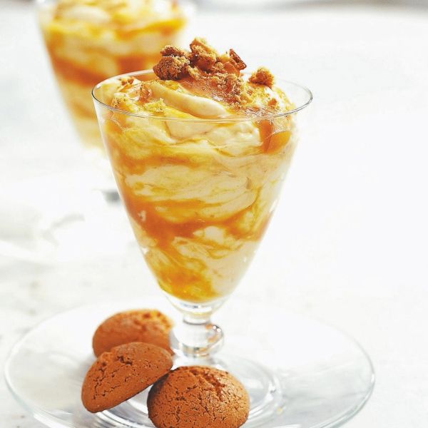 Postrežne kozarce do polovice nadevamo z jogurtovo mešanico, nato dodamo kaki in z dolgo žlico pazljivo premešamo tako, da ustvarimo vrtince. Če sladice ne bomo pojedli takoj, jo shranimo v hladilnik. Tik preden jo postrežemo, po vrhu posujemo z nadrobljenimi piškoti.