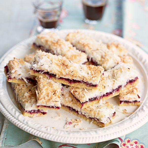 Pripravimo nadev. Z električnim mešalnikom stepemo beljake v sneg, nato pa postopoma dodajamo sladkor, da dobimo svetlečo beljakovo peno. Primešamo še kokosovo moko, nato zmes z žlico naložimo na marmelado in jo po njej enakomerno razmažemo. Po želji nadev posujemo s kokosovimi ostružki in pecivo pečemo 25 minut, da se zlato zapeče.