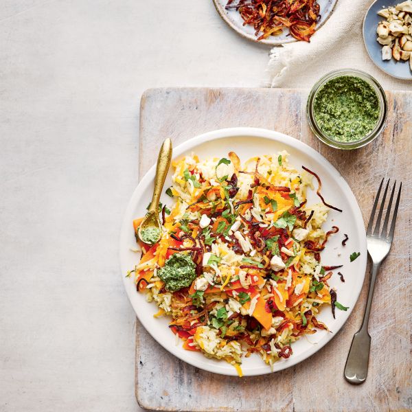 Ko pilav vsrka vso tekočino in je riž mehak, zrna razrahljamo z vilicami. Obložimo ga s koriandrovim pestom, posujemo s praženo čebulo, prihranjenim koriandrom in indijskimi oreški ter postrežemo.