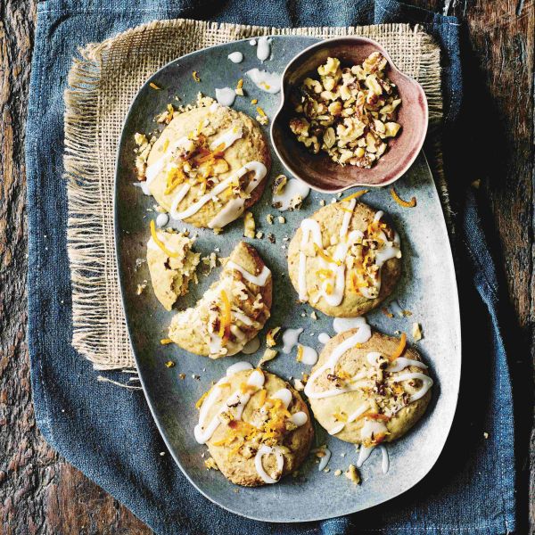 Za preliv zmešamo sladkor v prahu in pomarančni sok ter z njim okrasimo piškote. Nato jih posujemo z orehi in nastrgano pomarančno lupino ter za nekaj časa postavimo na stran. Piškoti so najboljši še isti dan, ko so pečeni, vendar jih lahko hranimo v nepredušno zaprti posodi v hladilniku do 2 dni.