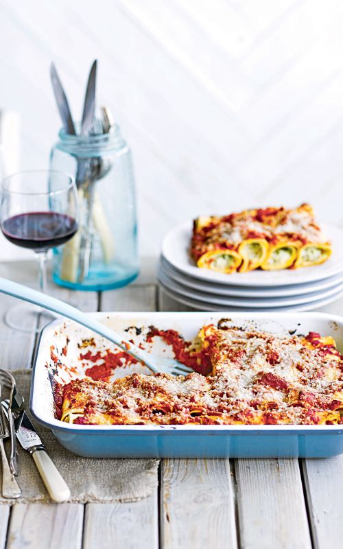 Čebulo olupimo in dobro sesekljamo. Bučke grobo nastrgamo, česen olupimo in stremo. V ponvi segrejemo olje in na njem 3 minute pražimo čebulo. Dodamo bučke in česen ter pražimo, dokler se bučke ne zmehčajo. Vmešamo dve tretjini skute in dve tretjini sira ter začinimo s soljo in poprom. Paradižnikovo omako segrejemo.
