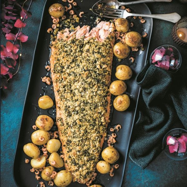 Losos z zeliščno skorjico in krompir s kozicami
