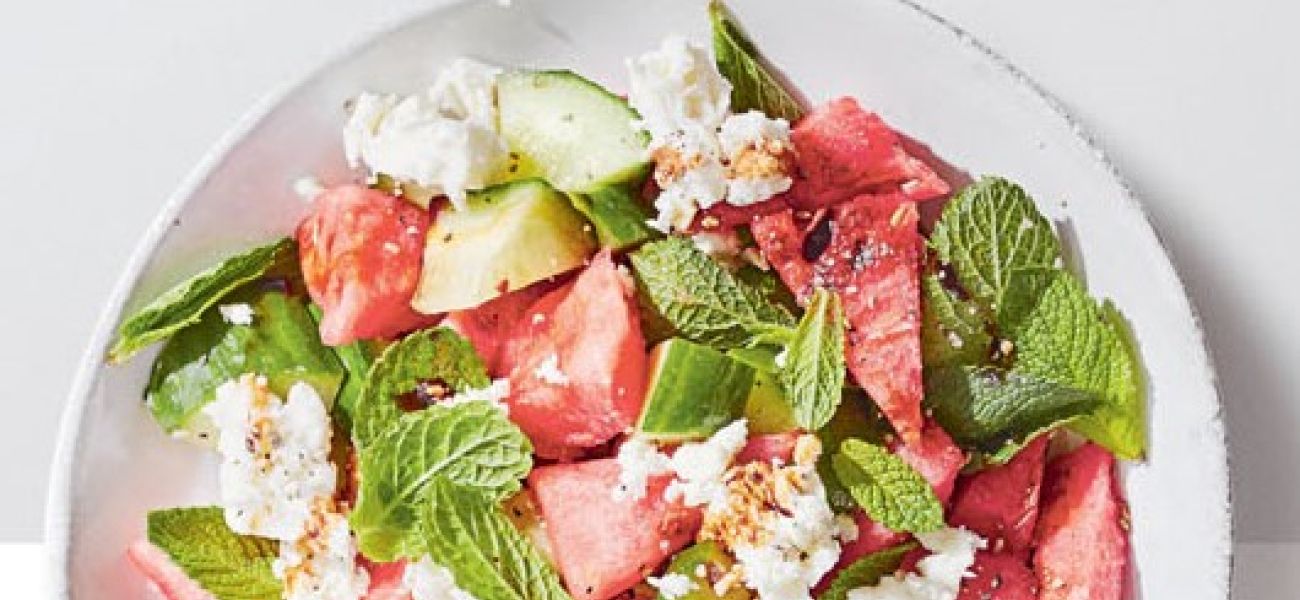 Lubenico in kumaro narežemo na kose in damo v skledo. Dodamo osmukane lističe mete (nekaj jih prihranimo za okras) in pokapamo z žlico oljčnega olja. Solimo in popramo ter preložimo na servirni krožnik. Na vrh nadrobimo feto, okrasimo s prihranjeno meto in tik pred postrežbo pokapamo z balzamično glazuro.