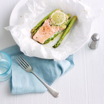 Postrvji paketki z limono, česnom in šparglji