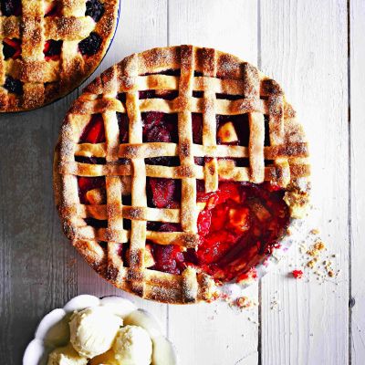 Polovico testa damo v pekač in ga poravnamo. Čezenj potresemo maline, na vrh pa z žlico nadevamo preostalo testo in ga grobo razporedimo – pri tem si lahko pomagamo s prsti. Potresemo z mandljevimi lističi in pečemo 50 minut, da se kolač zlato zapeče. Nato pustimo, da se ohladi, ga vzamemo iz modla, potresemo s sladkorjem v prahu in postrežemo.
