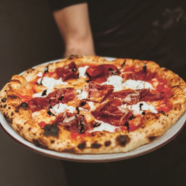 Na še vročo pico položimo na koščke natrgano bivoljo mocarelo in rezine bresaole. Pred postrežbo pico pokapamo z balzamično redukcijo.