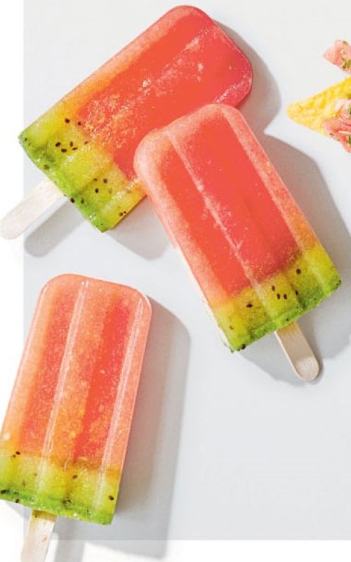 Za drugo (kivijevo) plast v mešalniku gladko zmeljemo še 1⁄2 banane, 100 g jogurta in olupljena ter narezana kivija. Mešanico nalijemo na mangovo plast in modelčke spet za 1 uro postavimo v zamrzovalnik.
