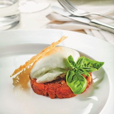 Paradižnikov tatar s sladoledom mladega sira in čipsom iz zbrinca