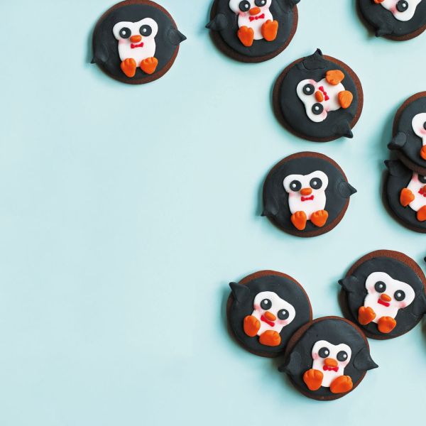 Za pingvinov trup in obraz razvaljamo belo sladkorno maso na približno enako debelino, kot smo črno. Izrežemo manjše krogce in s prsti raztegnemo zgornji del, da oblikujemo obrazek. Kjer se ta združi s trebuščkom, maso nekoliko stisnemo skupaj. Ko smo belo maso oblikovali, jo z malo vode prilepimo na črno maso.