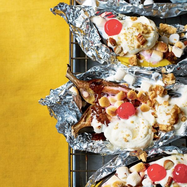 Banane na eni strani po dolgem prerežemo skozi lupino, da nekoliko zarežemo v meso, vendar ga ne prerežemo povsem. Ob zarezi jih razpremo, da nastane majhna vdolbina. Napolnimo jo s koščki čokolade in penastimi bomboni. Nato banane zavijemo v dve plasti aluminijaste folije; kjer je nadev, naj bo folija ohlapnejša, ker se bodo penasti bomboni nekoliko napihnili.