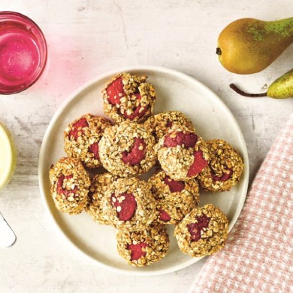 Pečico segrejemo na 200 °C (ali na 180 °C z ventilacijo) in dva velika plitva pekača obložimo s papirjem za peko. Banane damo v skledo, jih zmešamo s paličnim mešalnikom in nato dodamo kosmiče, mandlje, med, cimet in sol. Vse zmešamo, da dobimo lepljivo testo. Nežno primešamo zamrznjene maline. Z žlico zajemamo maso, oblikujemo kroglice in jih polagamo na pekača, nato jih z roko malce potlačimo.