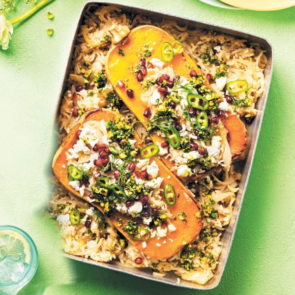 Pečena nadevana buča z zeliščno pistacijevo salso