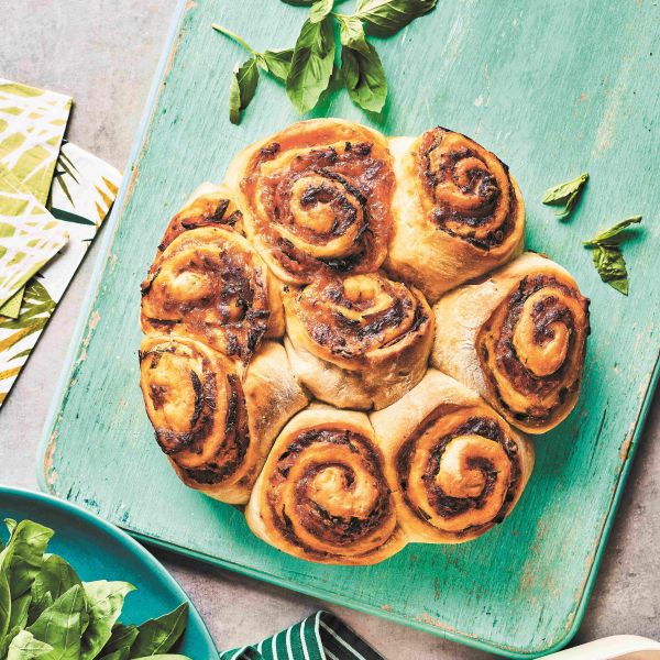 Testo premažemo z omako za pico, nato pa obložimo s sirom, rezinami salame in nasekljano baziliko. Začenši pri daljši stranici testo tesno zvijemo v rolo. Z ostrim nožem jo narežemo na osem kosov in jih s prerezano stranjo navzgor zložimo v model ali ponev. Polžke ohlapno pokrijemo in pustimo vzhajati še 30 minut, da narastejo in so videti rahli ter puhasti.