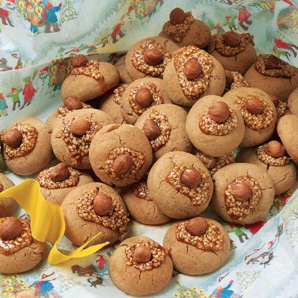 Za nadev svetlo karameliziramo sladkor. Dodamo maslo, sezam in sladko smetano. Pečene kroglice napolnimo s sezamovim nadevom in okrasimo s praženimi lešniki.