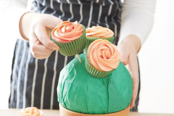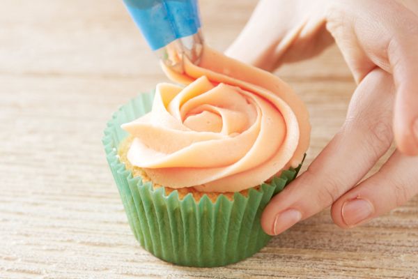 V vrečko za brizganje vstavimo velik ukrivljen zvezdast nastavek, nato jo napolnimo s polovico kreme in konec vrečke zasukamo, da jo zapremo. Vrečko držimo neposredno nad sredino kolačka in z enakomernim stiskanjem na kolaček spiralasto nabrizgamo kremo od sredine do roba. Ko pridemo do roba, za lep zaključek brizgalni nastavek sunkovito odmaknemo – če pa ta delček vseeno ni čisto gladek, ga lahko zakrijemo z listki. Ko smo kremo nabrizgali na 12 kolačkov, morebitno preostalo kremo iz vrečke postrgamo nazaj v skledo s prihranjeno kremo. Dodamo še malo barvila, da dobimo temnejši odtenek (če krema postane preredka, dodamo še malo sladkorja v prahu). Kremo stepemo, z njo spet napolnimo vrečko in okrasimo še preostalih 12 kolačkov. (Okrašene kolačke lahko zdaj shranimo na hladno za največ 1 dan; lahko v hladilnik, a pazimo, da jih vzamemo ven 30 minut pred postrežbo.)