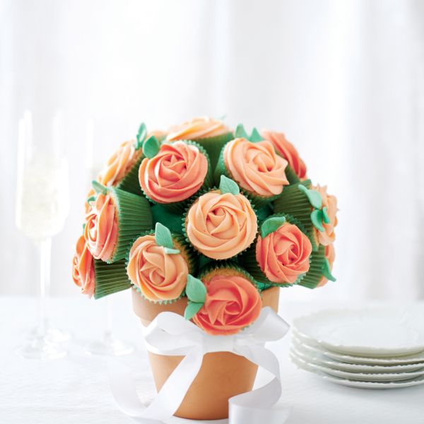 4. Na nabodalo namestimo kolaček. V kroglo z nabodali pričvrstimo še preostale kolačke, tako da so si čim bližje in da je celotna krogla pokrita. Okrog cvetličnega lončka lahko zavežemo okrasni trak. Postrežemo v uri ali dveh.