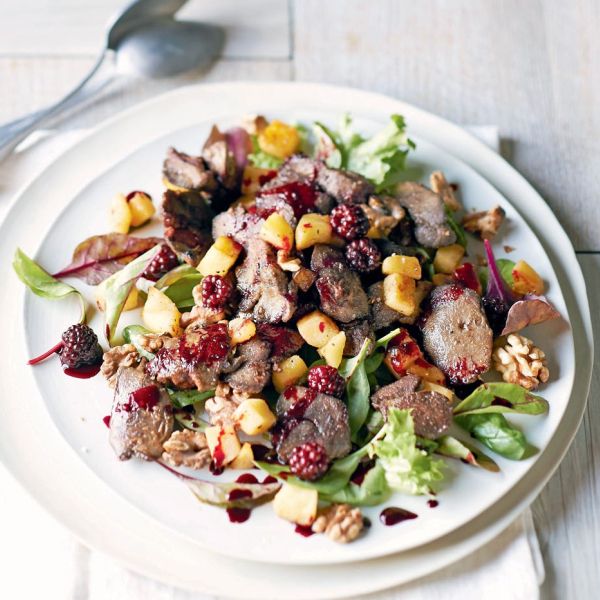 Pražena jetrca v solati z jabolki in robidovim prelivom