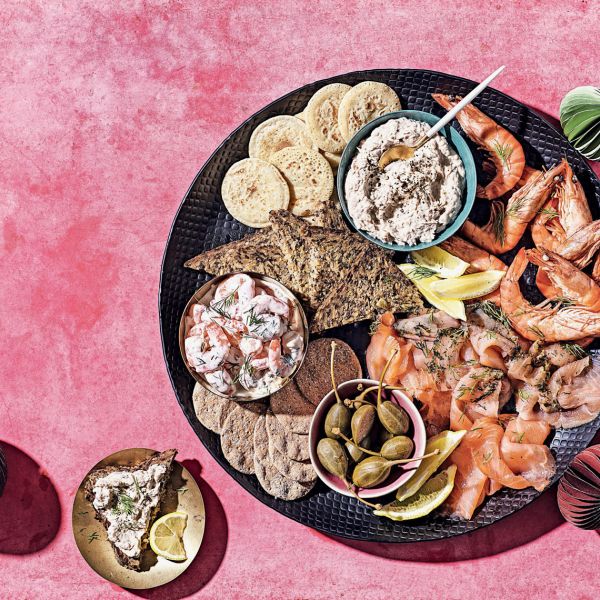 Pašteto preložimo v eno skledico, kozice pa v drugo. Obe postavimo na velik servirni krožnik in zraven razporedimo gravadlax, če ga imamo, dimljenega lososa, cele kozice, krekerje, kruh, bline, krhlje limone in kaprne plodove. Posujemo s koprom in postrežemo.