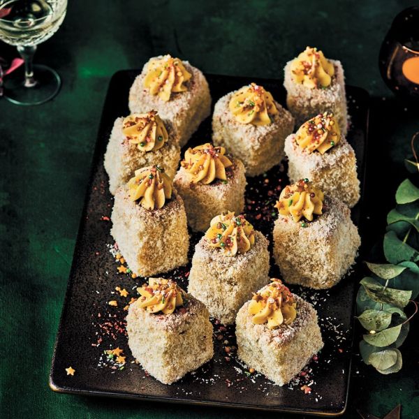 Biskvitu obrežemo morebitne neravne robove in ga skrbno narežemo na 25 kock. V vrh vsake kocke previdno naredimo luknjo, in sicer do treh četrtin globine. Obliv iz bele čokolade nežno segrejemo in vanj pomakamo biskvitne kocke, tako da so po vseh straneh oblite. Polagamo jih na kuhinjsko mrežico, da odvečni obliv odteče. Nato oblite kocke povaljamo v kokosu. Češnjevo marmelado zmešamo z limonovo lupinico. V vsako jamico biskvitnih kock damo malo marmelade. Ganaš stepemo, da je primeren za brizganje. Damo ga v dresirno vrečko in z zvezdastim nastavkom lično nabrizgamo v luknje. Kocke okrasimo s prazničnimi mrvicami ali zdrobljenim liofiliziranim jagodičjem in postrežemo.