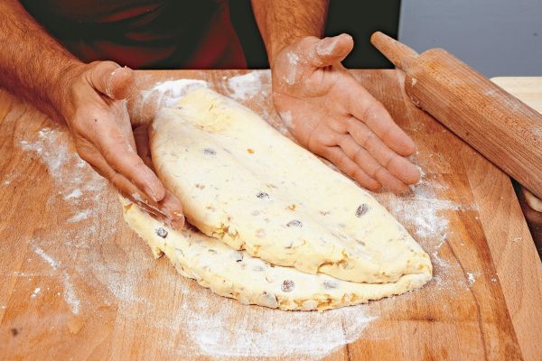 V skledo presejemo moko s pecilnim praškom, dodamo na koščke narezano maslo in naredimo maslene drobtine. Potem dodamo še preostale sestavine in vse skupaj zgnetemo v voljno testo. Na pomokani delovni površini oblikujemo testo v kolač posebne oblike, ga položimo na pekač, ki smo ga obložili s papirjem za peko in pečemo v prej ogreti pečici pri 160 °C približno 1 uro in 10 minut.