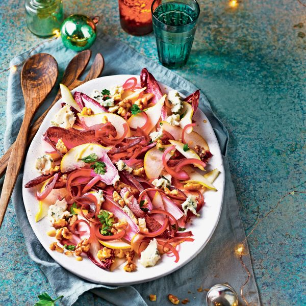 Čebuli dodamo hruške, radič in tri četrtine peteršiljevih lističev ter nežno zmešamo s prelivom. Ko postrežemo, posujemo z nekaj orehi, nadrobljenim sirom in preostalim peteršiljem.