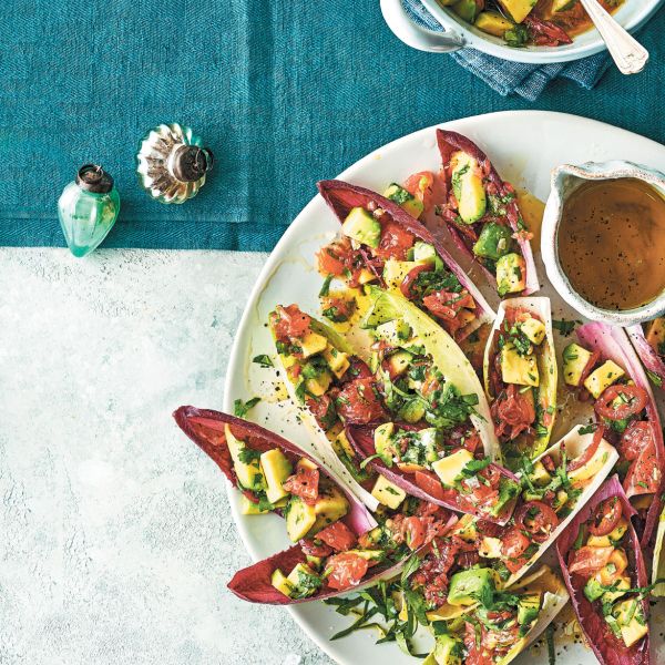 Radičevi čolnički s salso iz avokada in rožnate grenivke