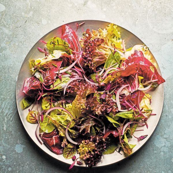 Čebulo narežemo na polmesece in jo za 30 minut namočimo v mrzlo vodo. Nato jo odcedimo, ožmemo in pomešamo z limonovim sokom. Solato ločimo na liste, jih natrgamo na manjše kose in damo v skledo.