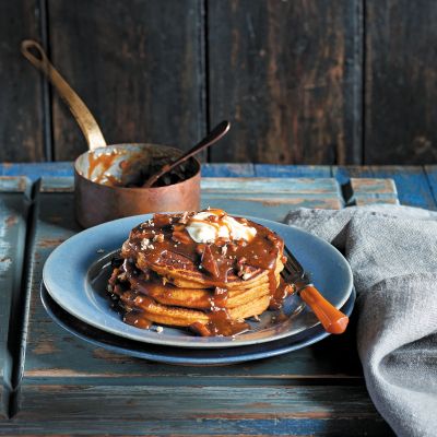 Debele bučne palačinke s soljenim maslenim karamelom z orehi