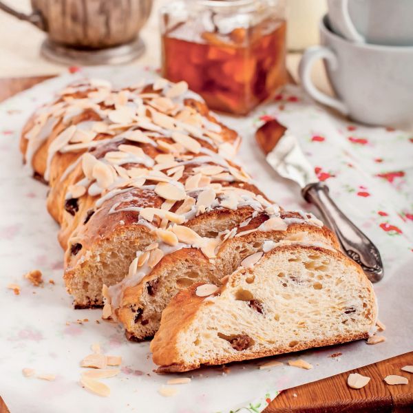 Za preliv zmešamo sok 1 limone s toliko sladkorja v prahu, da nastane tekoča pasta. Pokapamo jo po pletenici in posujemo z nežno popraženimi mandljevimi lističi.
