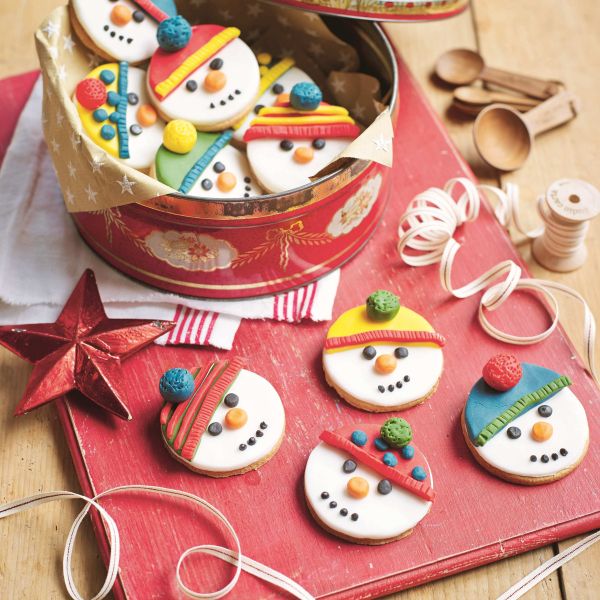 Po želji kape okrasimo še s pikicami in črticami iz sladkorne pisave. Iz obarvanega fondanta oblikujemo kroglice, z zobotrebcem po vsej površini naredimo luknjice in jih prilepimo na kape kot cofe. Iz oranžnega fondanta oblikujemo kepice za noske, iz črnega fondanta pa kroglice za oči. Malo jih sploščimo in prilepimo z belo sladkorno pisavo. S črno pisavo iz tube nabrizgamo pikice za nasmeške. Pustimo, da se okras strdi. Piškoti se v neprodušno zaprti posodi obdržijo do 5 dni.