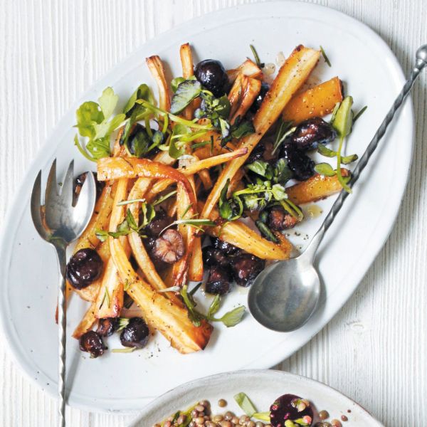 Solatne liste zmešamo z oljčnim oljem, jih solimo in popramo ter naložimo na velik krožnik. Po solati razporedimo pastinak, kostanj in sokove, ki so se nabrali pri peki.