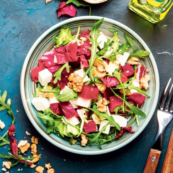 Solata iz radiča, zelene solate in rukole s peso, mocarelo in orehi