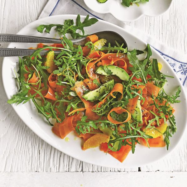 Korenje razpolovimo in ga z lupilnikom za zelenjavo narežemo na trakove. Avokado olupimo in narežemo na rezine, pomarančo olupimo in izrežemo krhlje (odstranimo tudi tanko kožico). Korenje, avokado in pomarančne krhlje damo skupaj z rukolo v skledo. Sok in nariban vrhnji sloj lupine polovice pomaranče zmešamo z oljčnim oljem. Preliv polijemo po solati, premešamo in začinimo po okusu.