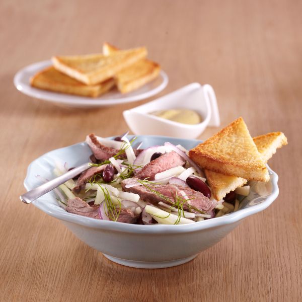 Solato razdelimo po skodelicah in dodamo narezano govedino. Pokapamo s prelivom in postrežemo.