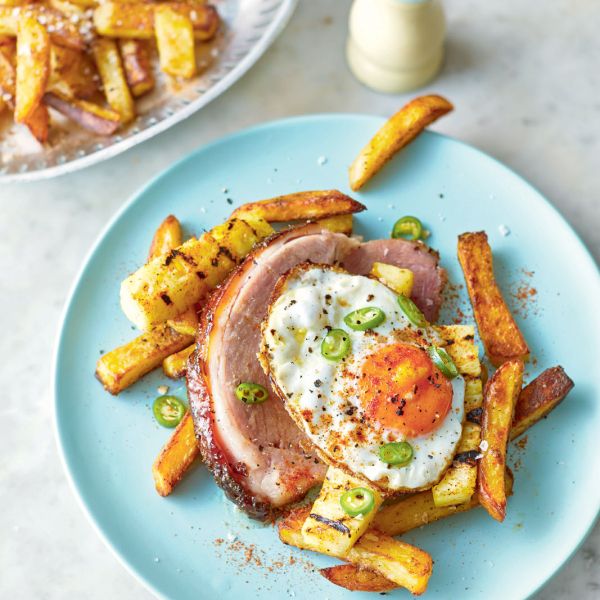 Šunka po karibsko z ananasom, jajci in krompirčkom