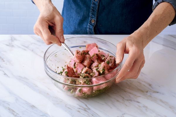 V srednje veliki skledi z metlico zmešamo sestavine za marinado. Vanjo damo kocke mesa in pomešamo, da so enakomerno obdane z njo. Pokrijemo in za 2 do 4 ure postavimo v hladilnik.