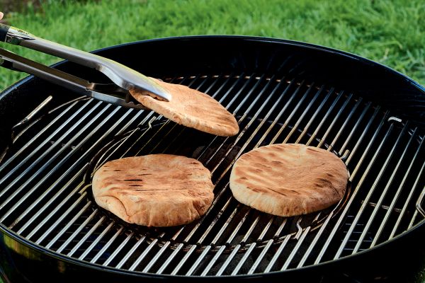 Kruhke pita na močni direktni vročini pečemo približno 15 sekund na vsaki strani, da dobijo rahel vzorec rešetke. Na sredino vsakega kruhka razporedimo malo cacikija. Kocke mesa potegnemo z nabodal in jih položimo na caciki. Kruhke prepognemo in postrežemo tople.