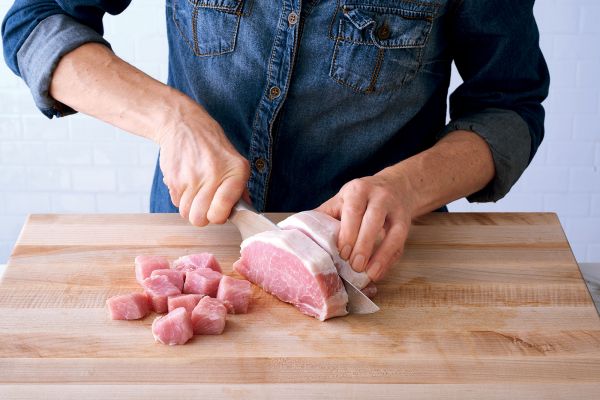 Meso narežemo na 2,5 cm debele rezine, te pa na 2,5 cm velike kocke.