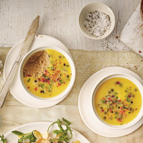 Grahova juha z jabolčnikom in meto ter hrustljavimi krutoni s panceto
