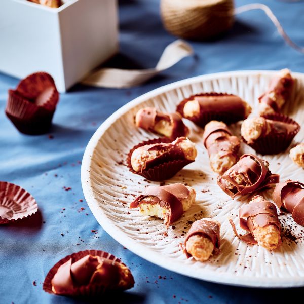 Mlečno čokolado z lupilnikom za zelenjavo narežemo na tanke rezine. Tartufe povaljamo v zdrobljenih vafljih, nato pa jih ovijemo v lističe mlečne čokolade, da dobimo nekakšne mumije. Položimo jih v okrasne papirčke in postrežemo ali pa jih zapakiramo v ljubke škatlice in podarimo. Obdržijo se 3 do 4 dni, najboljši pa so čisto sveži.