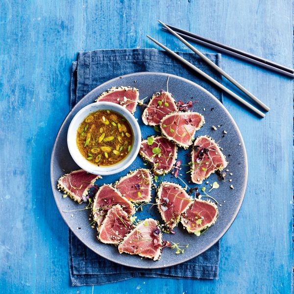 Zmešamo vse sestavine za omako. Preden tunino postrežemo, jo z zelo ostrim nožem narežemo na 0,5 cm debele rezine. Razporedimo jih na krožnik in posujemo z mikrozelenjem ali drobnjakom. Zraven ponudimo omako.